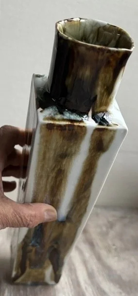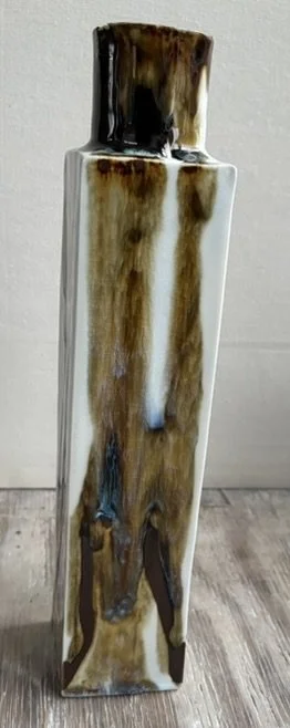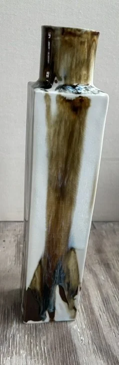 Brown/white porcelain slip cast bottle fired in a gas kiln. Food safe and dishwasher safe but recommend hand washing.